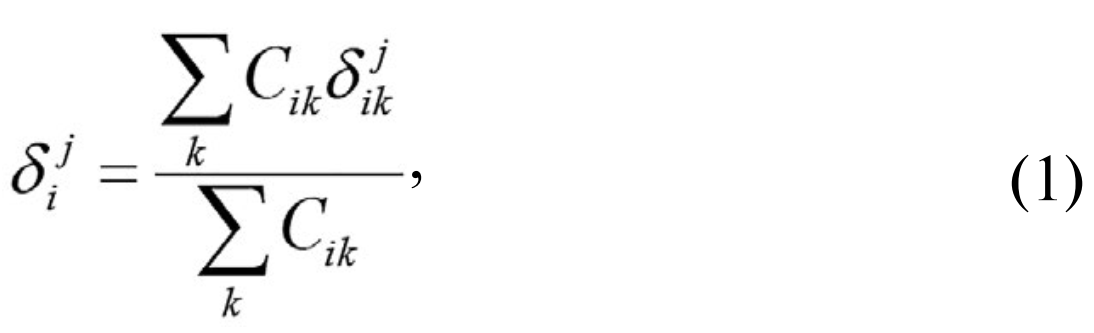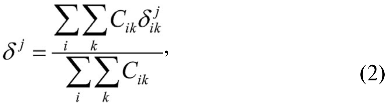 где Cik – концентрация i-го загрязняющего вещества, формируемого от всех источников выбросов в k-й точке регистрации жалоб, мг/м³; δjik – процент вклада j-го хозяйствующего субъекта (объекта) в концентрацию i-го загрязняющего вещества, формируемого от всех источников выбросов в k-й точке регистрации жалоб, %; δji – средневзвешенный процент вклада j-го хозяйствующего субъекта (объекта) в формирование жалоб населения на неприятный запах, обусловленный концентрацией i-го загрязняющего вещества, %.