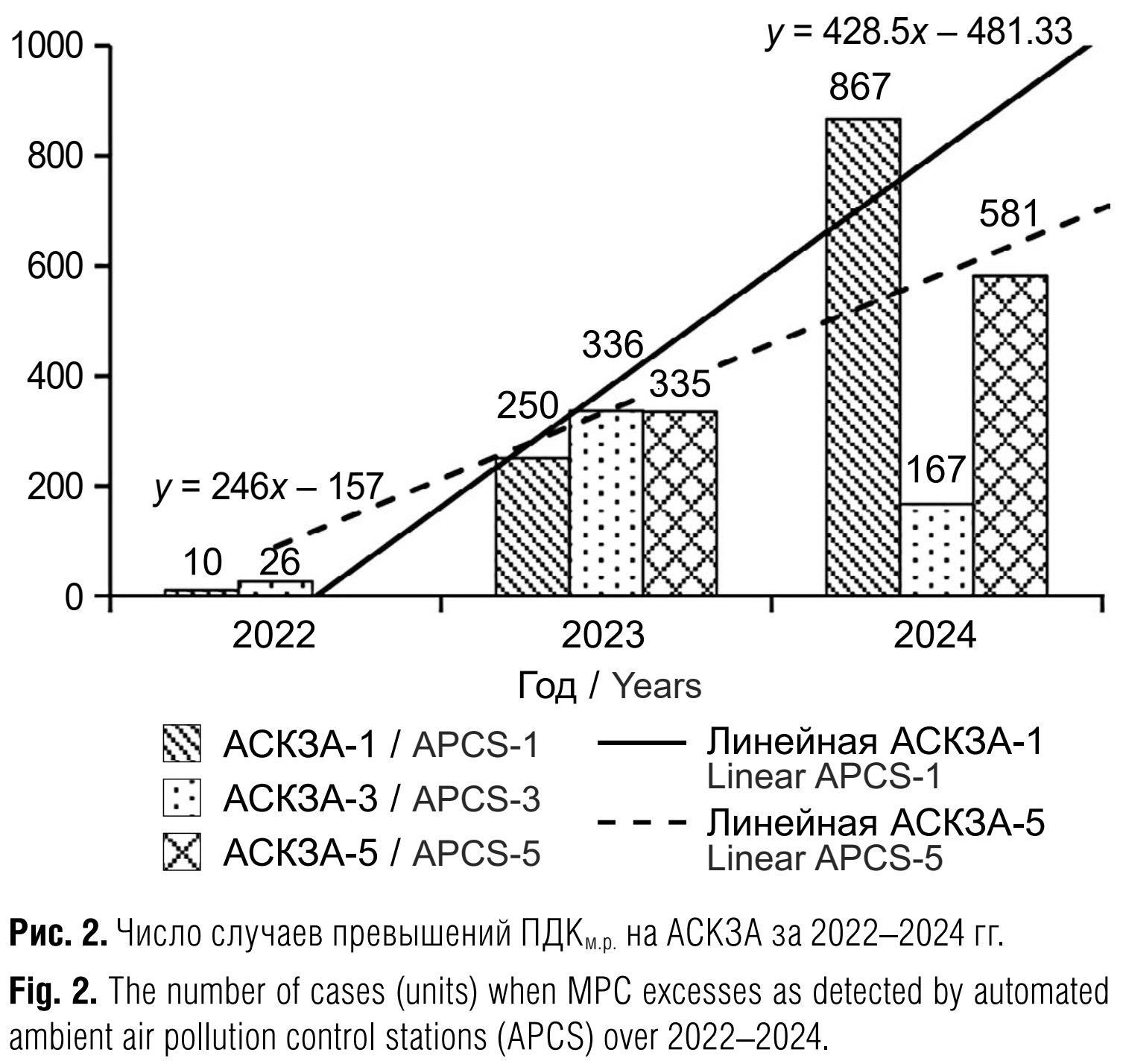 3. Данные автоматических станций контроля загрязнения атмосферного воздуха (АСКЗА-1, АСКЗА-3, АСКЗА-5) за 2022–2024 гг. подтверждают систематические превышения гигиенических нормативов содержания сероводорода с максимальными значениями АСКЗА-1 в 2024 г. до 17,5 ПДКм.р., 867 случаев превышений (4,5%); АСКЗА-5 в 2024 г. ‒ до 7,1 ПДКм.р., 544 случая превышений (2,9%); АСКЗА-3 в 2024 г. до 3,25 ПДКм.р., 8 случаев превышений (0,04%); формальдегида на АСКЗА-3 в 2024 г. – до 3,2 ПДКм.р., 125 случаев превышений (0,9%). Также отмечены единичные случаи превышения гигиенических нормативов и других химических веществ, обладающих неприятным запахом (аммиак до 1,5 ПДКм.р., азота диоксид до 1,63 ПДКм.р., фенол до 1,3 ПДКм.р., этилбензол до 1,2 ПДКм.р. и др.). При этом прослеживается тенденция к росту числа случаев с превышением предельно допустимых концентраций загрязняющих веществ на АСКЗА-5 (рис. 2).