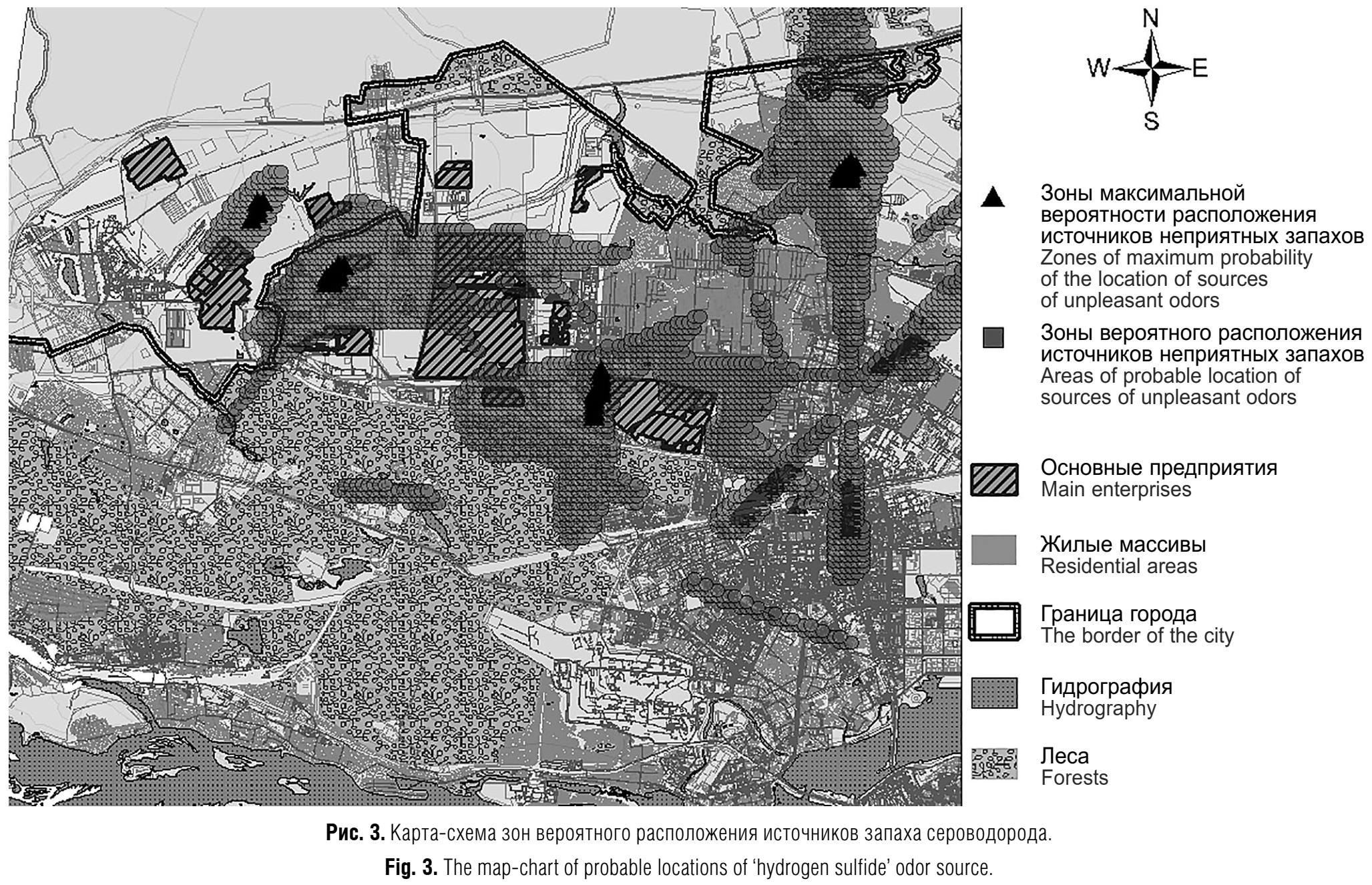 определены три ключевые зоны вероятного расположения источников с различными гедонистическими характеристиками (запах «газа» – 15,85 км², «химический» – 31 км², сероводорода – 31,8 км²), коррелирующие с расположением предприятий химического, нефтехимического и энергетического профиля, объектов коммунальной инфраструктуры;