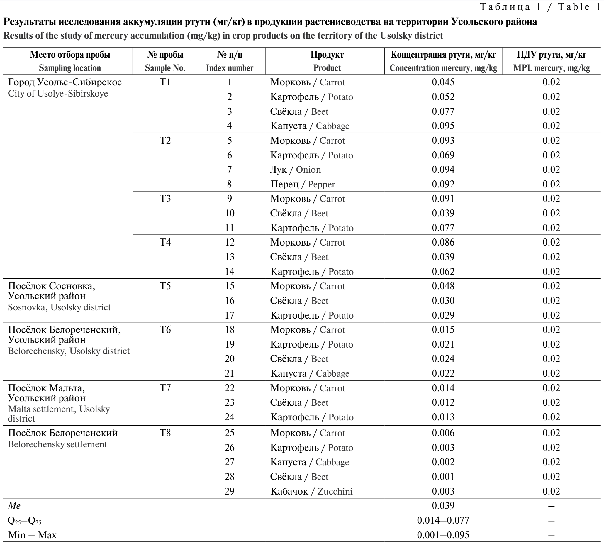 Результаты мониторинга содержания ртути в овощах на территории Усольского района представлены в табл. 1. Установлено, что в пробах плодоовощной продукции, отобранных на территории Усолья-Сибирского, содержание ртути было в пределах 0,039–0,095 мг/кг (1,95–4,75 ПДУ), наибольшее превышение отмечено в пробах моркови (Т3, 0,091 мг/кг), перца (Т2, 0,092 мг/кг), моркови (Т2, 0,093 мг/кг), лука (Т2, 0,094 мг/кг) и капусты (Т1, 0,095 мг/кг). В пробах, отобранных в п. Сосновка, п. Белореченский и п. Мальта, концентрации токсиканта составляли 0,001–0,048 мг/кг (0,05–2,4 ПДУ). Доля проб, в которых был превышен ПДУ ртути, составила в целом по Усольскому району 69%.