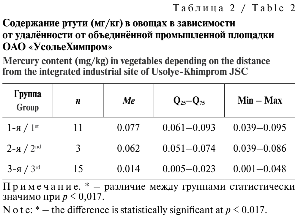Материалы и методы. Изучали содержание ртути в продуктах растениеводства, произведённых на территориях, подвергшихся воздействию объектов бывшего производства химической промышленности. Растительные образцы: картофель, морковь, свёкла столовая, капуста, лук, перец, кабачок. Пробоподготовку проводили с помощью лабораторной системы микроволнового разложения Milestone Ethos UP (Италия). Полученные результаты сравнивали с ПДУ, представленными в техническом регламенте ТР ТС 021/2011 «О безопасности пищевой продукции». В рамках медицинских осмотров проводили определение ртути в биосредах взрослых и детей, постоянно проживающих на территории Усольского района Иркутской области. Обследованы дети в возрасте 11‒16 лет. Ртуть определяли атомно-абсорбционным методом с предварительной минерализацией на специализированном анализаторе ртути серии «Юлия» в соответствии с утверждёнными методическими документами. Статистический анализ полученных результатов проводили с использованием программного обеспечения Jamovi с расчётом непараметрических критериев Краскела – Уоллиса и Манна – Уитни (с поправкой Бонферрони и без неё). Результаты представлены в виде медианы (Ме), межквартильного размаха(Q25–Q75) и Min – Max.