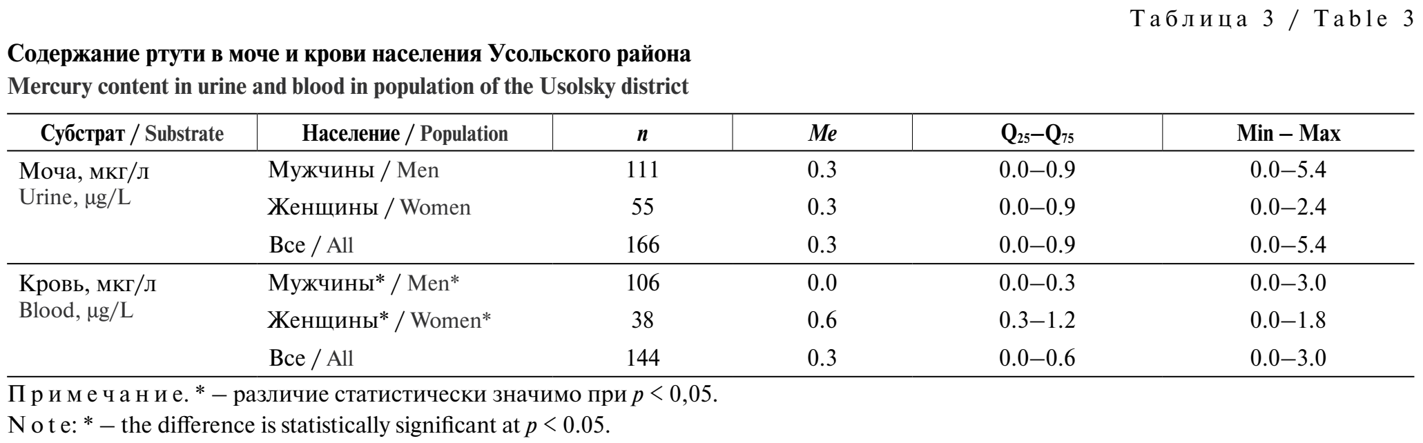 Результаты определения ртути в биосредах людей, проживающих на территории накопленного экологического ущерба, представлены в табл. 3. Установлено, что содержание ртути составляло 0–5,4 и 0–3 мкг/л в моче и крови соответственно. Превышений допустимых уровней содержания ртути в моче (до 10 мкг/л) [16, 17] не выявлено. Превышение референтного уровня в крови (2 мкг/л) [16] установлено в пяти пробах, при этом превышения нормальной средней концентрация ртути в крови относительно показателей, рекомендуемых ВОЗ (5‒10 мкг/л) [18], отсутствовали. Ртуть не идентифицирована в 38 и 44,4% проб мочи и крови соответственно. Содержание ртути в крови женщин и мужчин значимо различалось (среднегрупповой показатель у женщин был выше).
