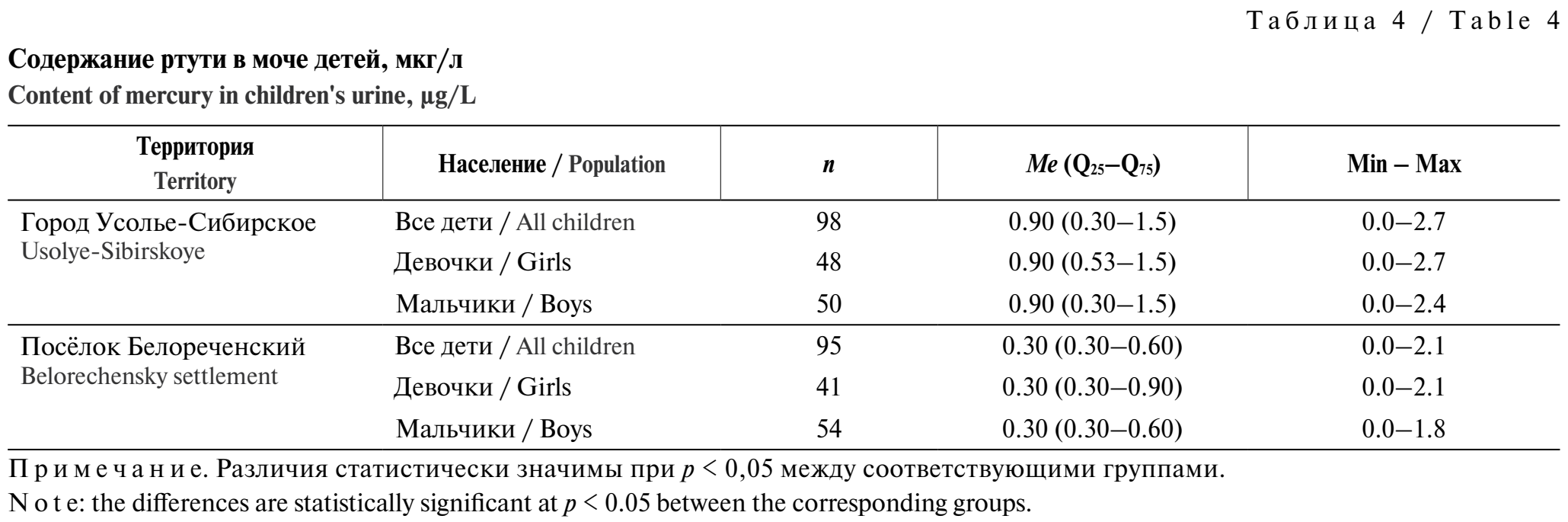 Результаты определения ртути в пробах мочи школьников, постоянно проживающих на территории г. Усолье-Сибирское и п. Белореченский, представлены в табл. 4. Установлено, что медианный показатель уровня Pb в моче школьников Усолья-Сибирского в 3 раза статистически значимо выше, чем у детей п. Белореченский. Сравнение по гендерному признаку не выявило различий содержания ртути в моче детей Усолья-Сибирского. Превышений допустимых уровней содержания ртути в моче (до 10 мкг/л) не выявлено.