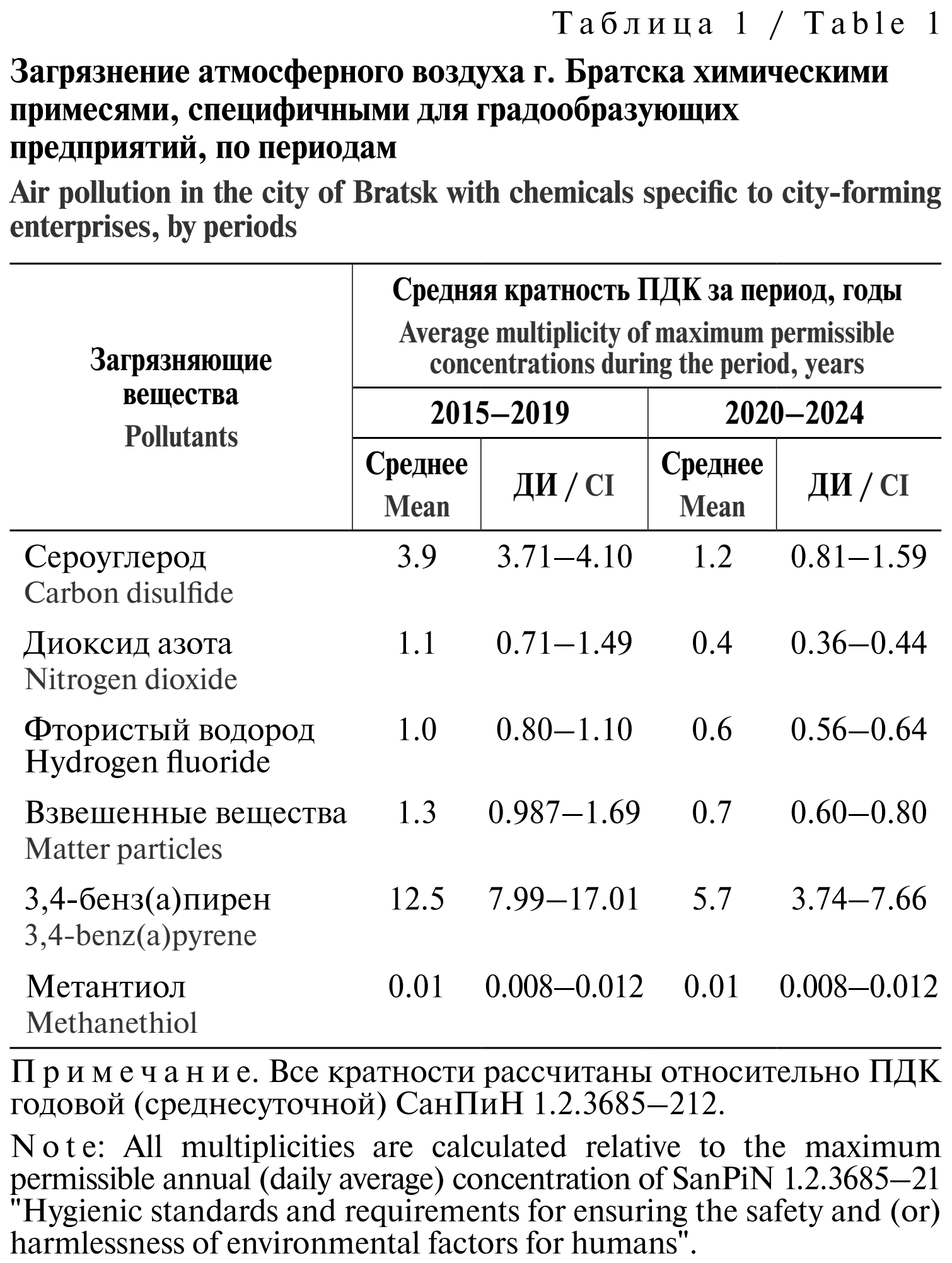 В проект «Чистый воздух» уже на первом этапе вошёл Братск – ведущий промышленный центр Восточной Сибири, одна из территорий, требующих срочного улучшения качества атмосферного воздуха [9]. На территории города размещено несколько крупных предприятий по производству алюминия, продуктов лесопереработки и лесохимии, машиностроения, теплоэнергетики, что обусловлено существующей сырьевой базой и дешёвой электроэнергией ГЭС. Ранее с учётом сроков активного внедрения природоохранных мероприятий на основных предприятиях Братска (1995–1999, 2005–2010 гг.) нами была изучена динамика содержания поллютантов в приземном слое атмосферного воздуха за 1984–2022 гг. в сравнении с актуальными в настоящее время гигиеническими нормативами² [10]. Установлено, что при низком уровне природоохранной деятельности (1984–1988 гг.) на постах наблюдения гидрометслужбы регистрировалось постоянное превышение среднегодовых ПДК бенз(а)пирена, сероуглерода, оксидов азота, фтористого водорода. Наблюдалось превышение норматива содержания сероводорода до 8 раз (16% разовых проб), фтороводорода – до 52 раз (58% проб), сероуглерода – до 20,5 раза (4–29% проб), диоксида азота – в 3,6 раза (3–20% проб), бенз(а)пирена – в 88 раз. В период реализации программы «Экология г. Братска» по сравнению с предшествующим десятилетием снизилось содержание в воздушном бассейне города сероуглерода (в 1,8–2,2 раза), 3,4-бенз(а)пирена (в 1,9–2,5 раза), диоксида азота (в 2,5 раза). Вместе с тем после завершения активной реализации программы зафиксировано увеличение среднегодовых концентраций некоторых веществ. Анализ впервые выявленной заболеваемости в период реализации природоохранных программ свидетельствовал об инерционности динамики популяционного здоровья и различии вкладов отдельных факторов в его формирование [9].