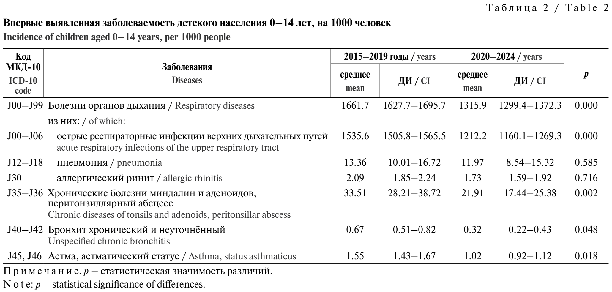 Среднегодовые показатели впервые выявленной заболеваемости по классу болезней органов дыхания и отдельным нозологическим формам представлены в табл. 2.