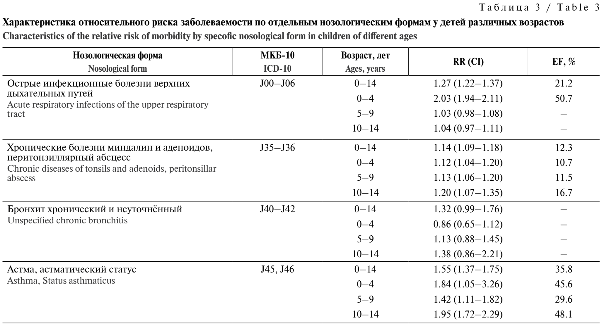 Для доказательства различий уровней заболеваемости в изучаемые периоды представим результаты расчётов относительного риска для случаев, когда RR ≥ 1. Так, в целом по классу БОД (впервые выявленная заболеваемость) RR составил 1,28 CI (1,19–1,37), этиологическая доля внешних факторов оценивается в 21,8%, по ОРЗ – 1,28 CI (1,2–21,34), EF = 21,7. Наибольшие уровни риска ОРЗ отмечены в возрасте 0–4 года (RR = 2,03; EF = 50,7), для хронических болезней миндалин, аденоидов – в 10–14 лет (RR = 1,2; EF = 16,7). По частоте бронхиальной астмы и астматического статуса можно выделить две группы риска: 0–4 года (RR = 1,84; EF = 45,6) и 10–14 лет (RR = 1,95; EF = 48,1). Поскольку показатель RR для хронического бронхита и ОРЗ верхних дыхательных путей в старших группах не имел статистической значимости, для них этиологическую долю не вычисляли (табл. 3).