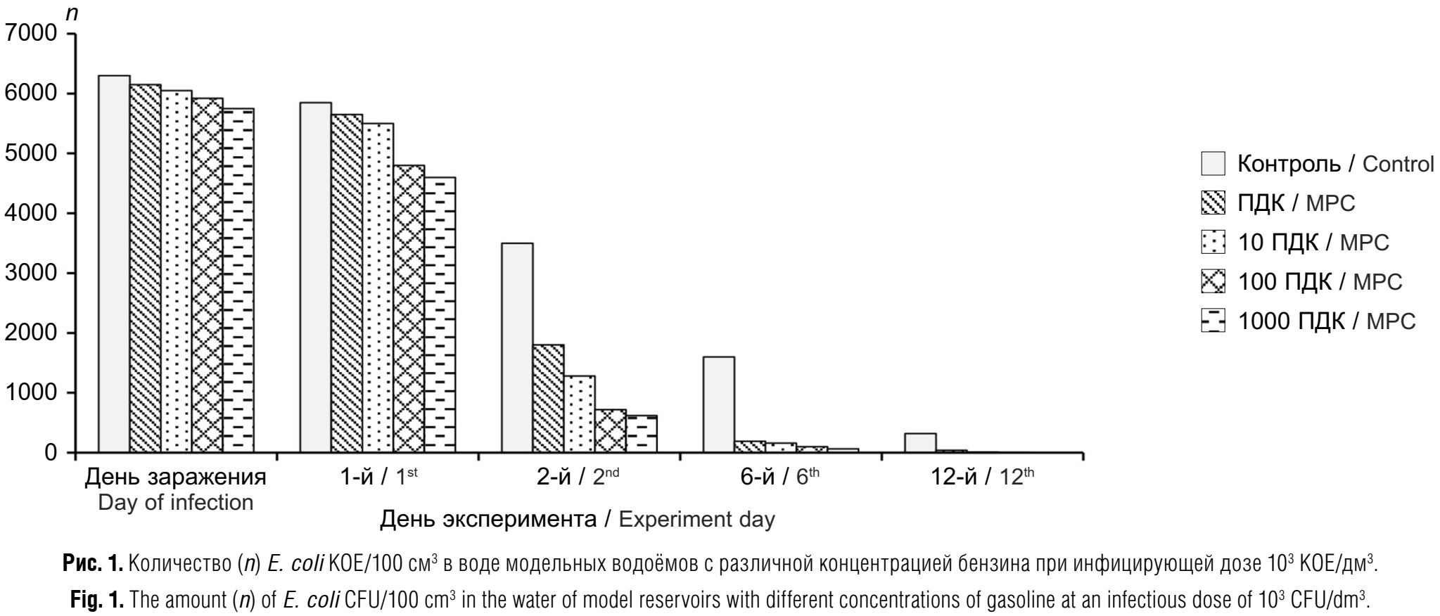 Материалы и методы. Состояние микробных сообществ в воде водных объектов изучали в экспериментальных условиях с добавлением в речную воду нефтепродуктов: бензина неэтилированного марки АИ-95 и мазута марки М-100. В 28 экспериментальных модельных водоёмов добавляли бензин на уровне ПДК (0,1 мг/дм³), 10 ПДК, 100 ПДК, 1000 ПДК и суспензию потенциально патогенных тест-микроорганизмов Еscherichia сoli, Enterococcus faecalis, Pseudomonas aeruginosa и патогенных микроорганизмов Salmonella typhimurium. В 16 модельных водоёмов вносили мазут, создавая плёнку толщиной 1 см или взвесь капель в толще воды, и суспензии Еscherichia сoli, Enterococcus faecalis, Pseudomonas aeruginosa, Staphylococcus aureus и патогенных микроорганизмов Salmonella enterica (подвид enterica, серотип enteritidis). Инфицирующая доза микроорганизмов для модельных водоёмов составляла 10² КОЕ/дм³, 10³ КОЕ/дм³, 10⁴ КОЕ/дм³. Эксперимент по изучению воздействия бензина на санитарно-показательные и патогенные микроорганизмы продолжался 14 сут, мазута – 30 сут.