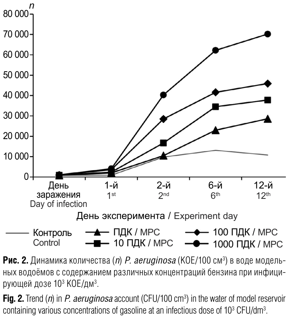 Результаты эксперимента по выявлению P. aeruginosa свидетельствуют о наличии прямой зависимости в нарастании массы клеток синегнойной палочки при увеличении концентрации бензина в воде водоёма и времени экспозиции. К 12-м суткам контакта выявлены особенности процесса формирования микробиоты в опытных водоёмах в зависимости от первоначально внесённой дозы клеток по сравнению с уровнем P. аeruginosa, определённым в контрольном водоёме Так, при инфицирующей дозе 10² КОЕ/100 см³ наблюдали активный процесс размножения клеток P. aeruginosa, превышение массы клеток по сравнению с контролем в воде водоёма с концентрацией бензина на уровне ПДК составило в 9,7 раза, 10 ПДК – в 19,8 раза, 100 ПДК – в 24,4 раза, 1000 ПДК – в 28,7 раза. При увеличении инфицирующей дозы до 10⁴ КОЕ/100 см³ в воде водоёма с концентрацией бензина на уровне ПДК выявлено превышение содержания P. aeruginosa по сравнению с контрольным водоёмом в 0,9 раза, 10 ПДК – в 1,2 раза, 100 ПДК – в 1,6 раза, 1000 ПДК – в 2,1 раза, что свидетельствует о замедлении процесса размножения клеток P. аeruginosa за счёт накопления продуктов обмена веществ клеток и истощения питательных компонентов среды.