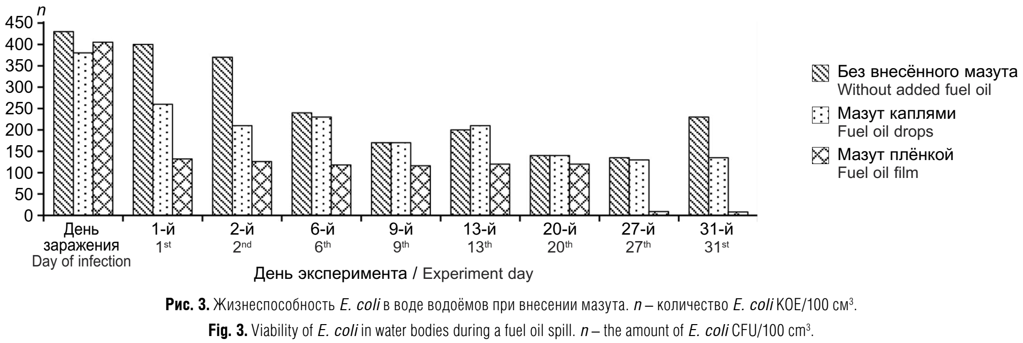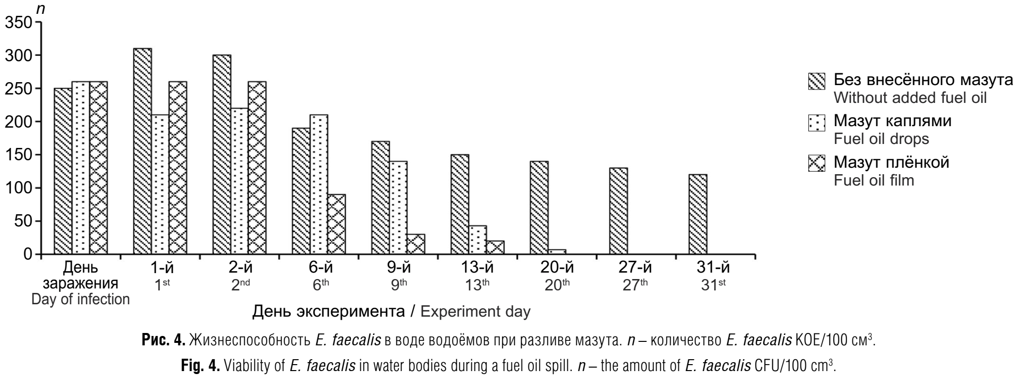Данные эксперимента показывают, что в течение 20 сут при разливе мазута индикаторная значимость E. faecalis и E. coli сохранялась, о чём свидетельствует возможность обнаружения патогенной микрофлоры в воде. Присутствие мазута в воде, независимо от способа его распределения, приводило к 100%-й гибели клеток S. aureus через 48 ч контакта.