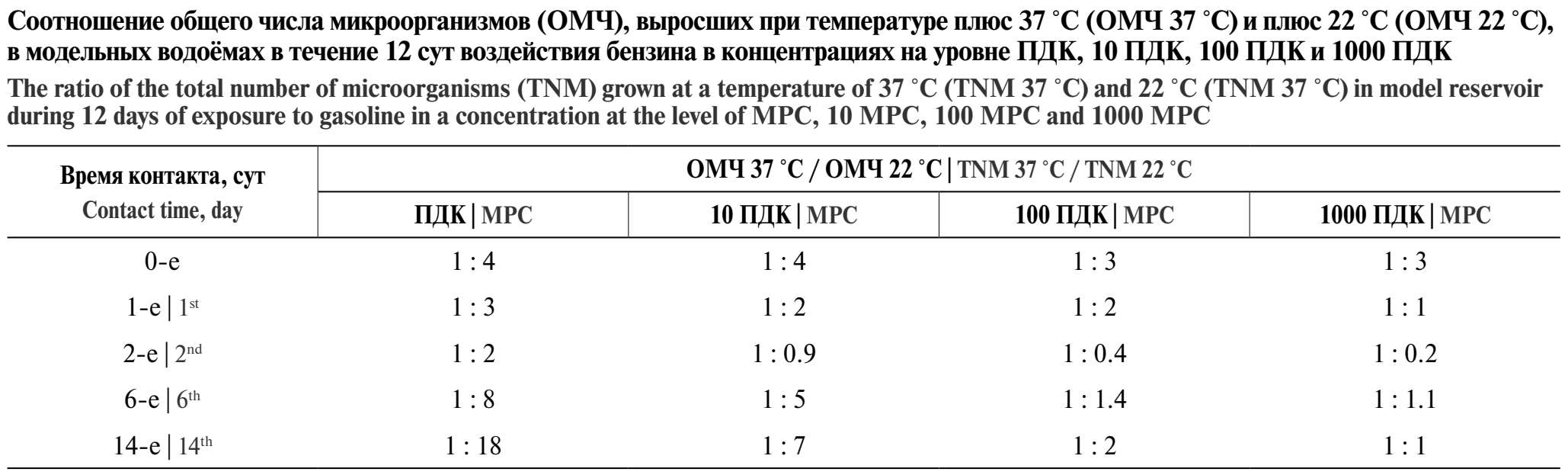Полученные результаты исследования свидетельствуют о том, что изменение количества микрофлоры в воде водоёмов с концентрацией ПДК и 10 ПДК бензина имело однонаправленную тенденцию к снижению в течение первых 48 ч (tэмп = 2) и увеличению массы клеток в течение 6–14 сут (tэмп = 3 – зона незначимых изменений). В воде водоёма с концентраций 100 ПДК бензина в первые 24 ч наблюдалось преимущественное снижение аллохтонной микрофлоры до 89,3%, снижение естественной аутохтонной микрофлоры было менее выражено – в пределах 50,5%. В то же время в водоёме с содержанием 1000 ПДК бензина наблюдалась достоверная гибель как аллохтонной, так и аутохтонной микрофлоры на уровне 92% (tэмп = 12) по сравнению с контролем, которая достигала критических значений к 48 ч эксперимента и приводила к резкому торможению процессов самоочищения воды водоёмов (см. таблицу).