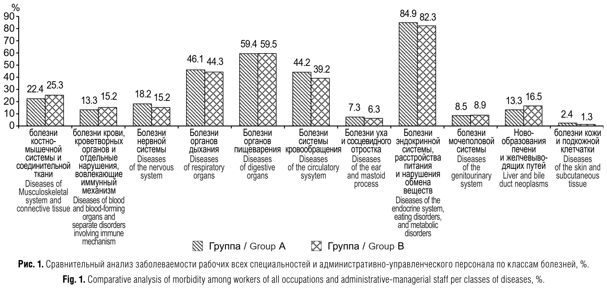 Анализ результатов комплексного клинико-лабораторного и функционального обследования, показал, что распространённость болезней основных классов у рабочих группы А не отличалась от показателей группы В (р = 0,07–0,99). В структуре заболеваемости доминировали болезни эндокринной системы, органов пищеварения, органов дыхания и кровообращения (р = 0,46–0,99) (рис. 1).