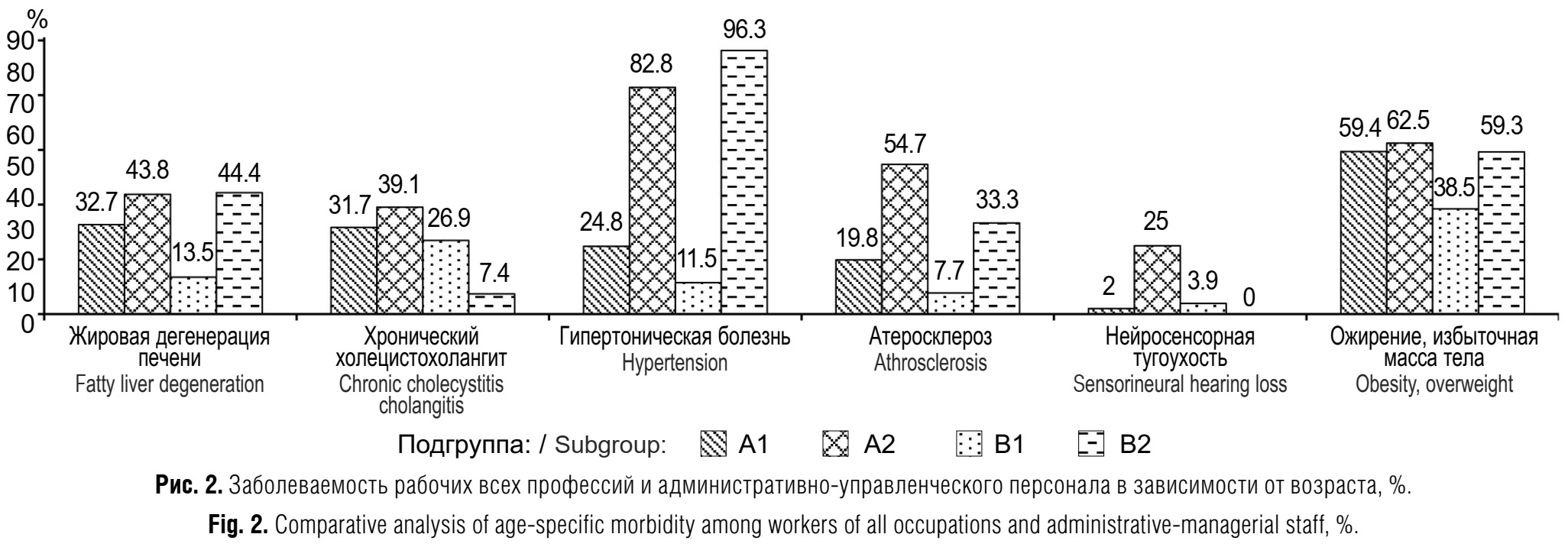Сравнительный анализ заболеваемости работников предприятия различного возраста показал, что распространённость основных болезней классов и структура заболеваемости у молодых рабочих (А1) не отличалась от показателей административного персонала (B1) (р = 0,13–0,97): доминировали болезни эндокринной системы, патологии органов пищеварения, болезни органов дыхания и болезни системы кровообращения (р = 0,14–0,88). В то же время в подгруппе А1 в 1,6–2,6 раза чаще регистрировались случаи гипертонической болезни, жировой дегенерации печени, атеросклероза и ожирения (избыточной массы тела) (р = 0,01–0,05), вероятность развития которых была в 2–3 раза выше (OR = 2,34–3,15; DI = 1,02–9,73). У рабочих подгруппы А2 распространённость болезней основных классов также не имела различий с подгруппой B2 (р = 0,12–0,49), однако отличалась от таковой у рабочих молодого возраста: после болезней эндокринной системы (болезни щитовидной железы, сахарный диабет, ожирение и другие виды избыточности питания, нарушения обмена веществ) (р = 0,16–0,45 к подгруппе А1), на втором месте были болезни системы кровообращения (р < 0,0001) и лишь на третьем – органов пищеварения (р = 0,33) и дыхания (р = 0,86). Одновременно частота выявления хронического холецистохолангита, атеросклероза и нейросенсорной тугоухости в подгруппе А2 в 1,6–3,6 раза превышала показатели подгруппы B2 (р < 0,0001–0,03), а вероятность их развития была в 2,8–8,7 раза выше (OR = 2,87–8,67; DI = 1,09–20,09), при этом профессиональная обусловленность нейросенсорной тугоухости достигала 86% (RR = 7,17; Cl = 1,34–20,7; EF = 86,1) (рис. 2).