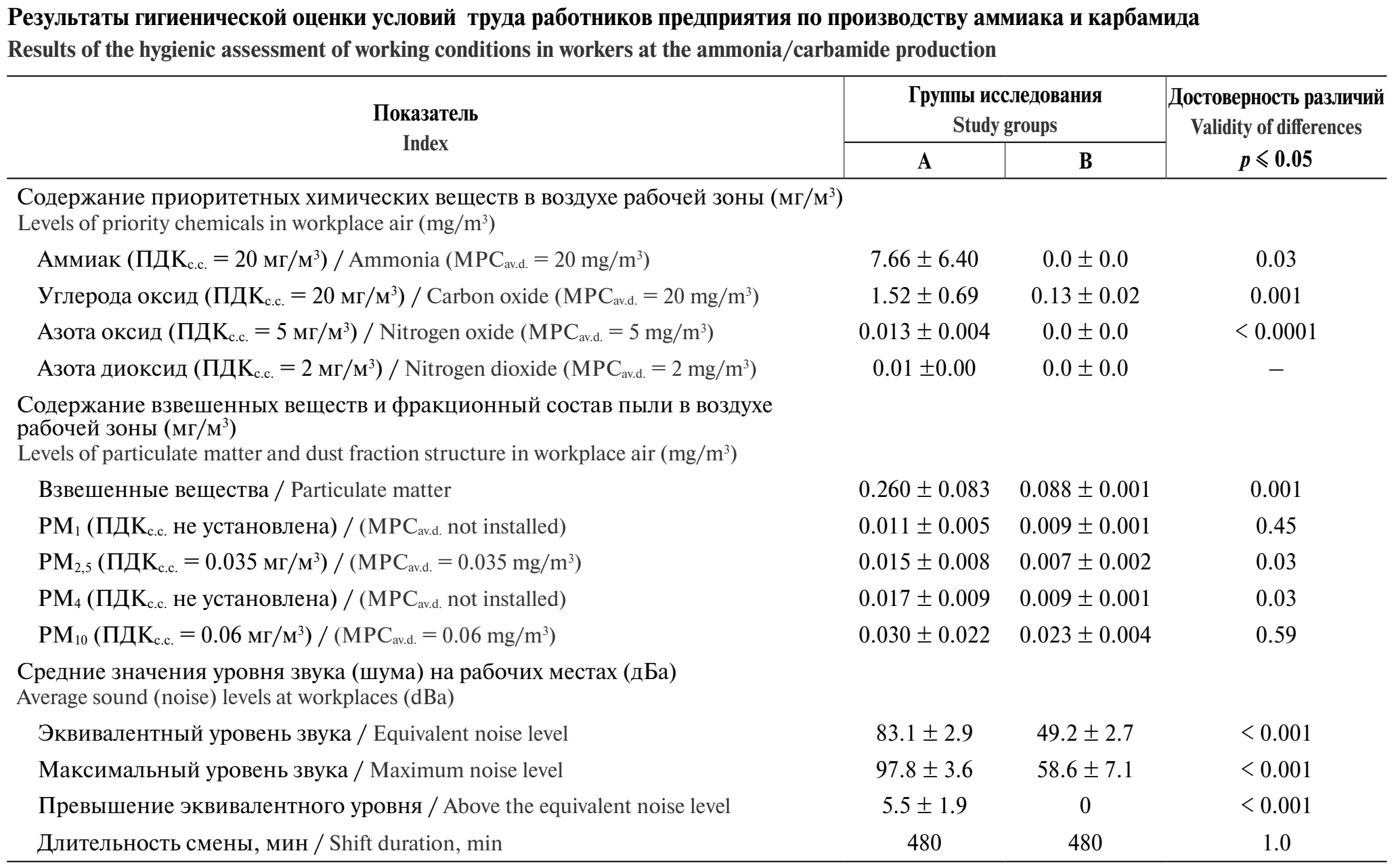 Материалы и методы. Обследованы 244 сотрудника предприятия по производству аммиака и карбамида; группа наблюдения – 165 рабочих (возраст – 42,2 ± 1,6 года, стаж – 11,6 ± 1,5 года), группа сравнения – 79 сотрудников администрации (возраст 42,9 ± 2,8 года, стаж 10,5 ± 1,6 года; р = 0,32–0,58). Группы были разделены по возрасту, стажу и профессиональной принадлежности (р = 0,13–0,97). Оценка условий труда выполнена санитарно-гигиеническими, химико-аналитическими и инструментальными методами; состояние здоровья работников оценивалось по результатам медико-социологического анкетирования, общеклинических, функциональных, инструментальных и лабораторных исследований.