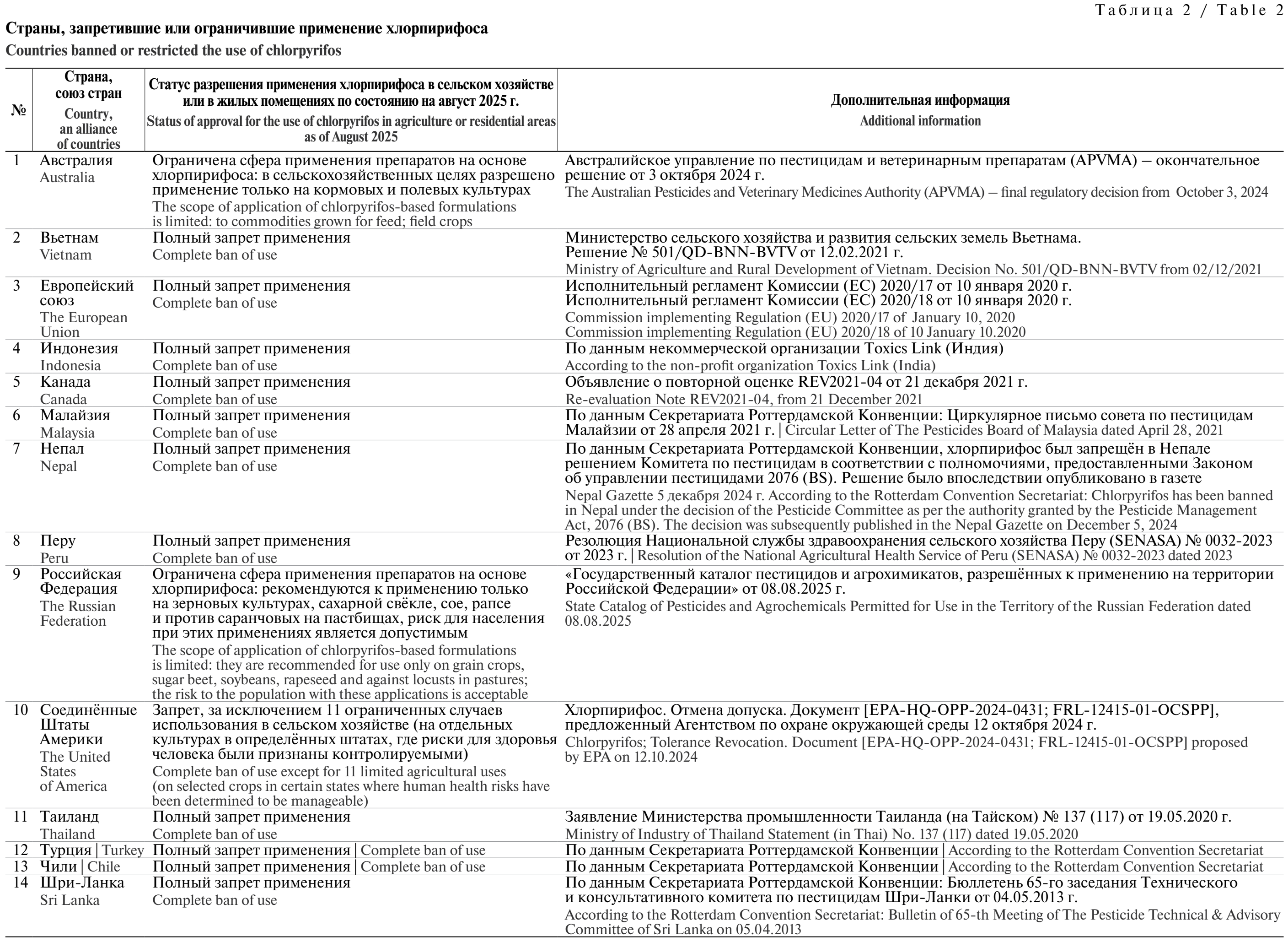 В Российской Федерации в соответствии с «Государственным каталогом пестицидов и агрохимикатов, разрешённых к применению на территории Российской Федерации» имеют государственную регистрацию в качестве инсектицида при наземном применении 18 препаратов на основе ХПФС, но ни одного препарата на основе ХПФС-метила [60]. В связи с получением в 2015 г. новых данных о токсичности ХПФС [5, 14] на основании решения совместного заседания Комиссии по проблемам гигиены и токсикологии пестицидов и агрохимикатов Роспотребнадзора и Научно-экспертного совета Центра по гигиенической регламентации средств химизации сельского хозяйства ФБУН «ФНЦГ им. Ф.Ф. Эрисмана» Роспотребнадзора (от 25.02.2015 г.) с токсиколого-гигиенических позиций была ограничена сфера применения препаратов на основе ХПФС. В настоящее время в Российской Федерации препараты на основе ХПФС рекомендуются к применению только на зерновых культурах, сахарной свёкле, сое, рапсе и против саранчовых на пастбищах. Элементы урожая указанных культур используются в питании населения в виде продуктов переработки (мука, масло растительное, сахар и др.) или идут на корм скоту. Данное обстоятельство способствует минимизации рисков негативного воздействия ХПФС на население. В табл. 2 представлен список стран, полностью запретивших или значительно ограничивших применение хлорпирифоса в сельском хозяйстве или в жилых помещениях (согласно собранной в рамках данного литературного обзора информации).