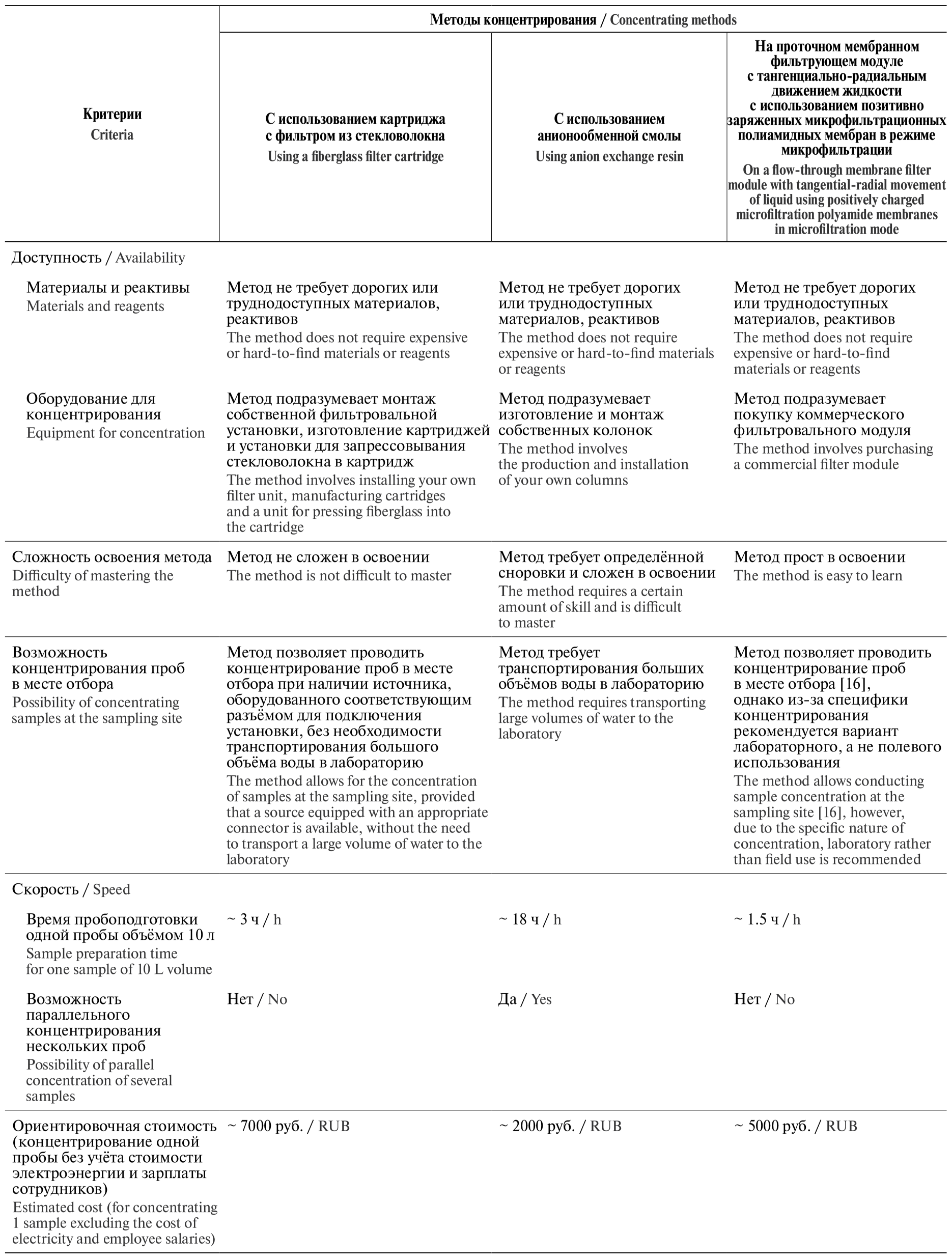 Тем не менее следует помнить, что в рутинной практике при исследовании различных типов вод на наличие ПБА вирусной этиологии эффективность пробоподготовки имеет большое, но не единственно важное значение. При выборе способа пробоподготовки следует учитывать весь комплекс критериев, таких как возможности конкретной лаборатории, доступность расходных материалов, наличие оборудования, скорость и экономическая рентабельность используемого метода и др. Критерии выбора методов пробоподготовки представлены в табл. 2.
