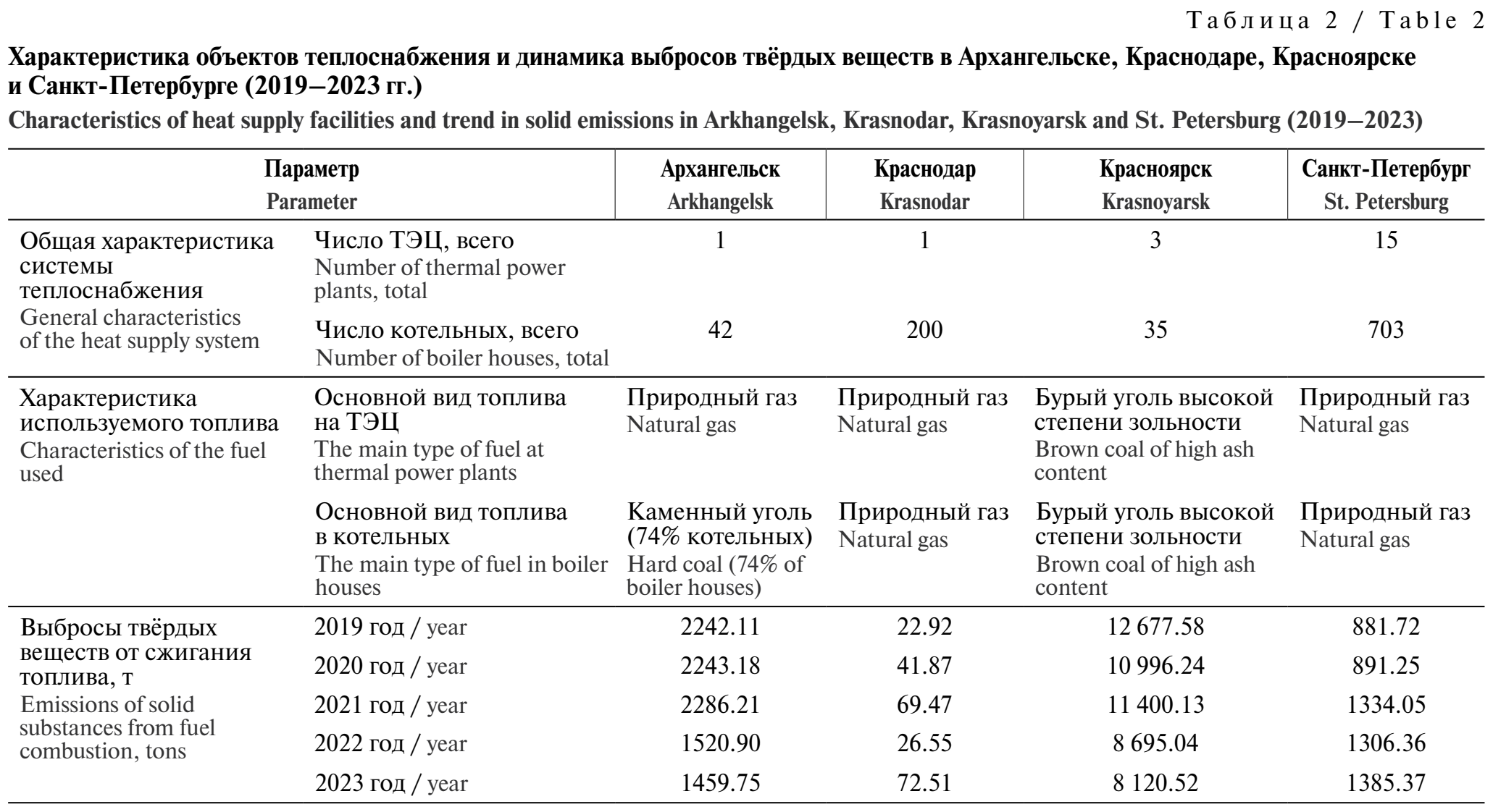 Для оценки вклада объектов теплоснабжения в загрязнение атмосферного воздуха проведён ретроспективный анализ выбросов твёрдых веществ в результате сжигания топлива в четырёх исследуемых городах, различающихся по типу используемого топлива (табл. 2). Анализ характеризует период 2019–2023 гг. на основе данных формы федерального статистического наблюдения № 2-ТП (отходы) (приказ Росстата от 06.11.2025 г. № 614 «Об утверждении формы федерального статистического наблюдения № 2-ТП (отходы) «Сведения об образовании, обработке, утилизации, обезвреживании, размещении отходов производства и потребления» и указаний по её заполнению»).