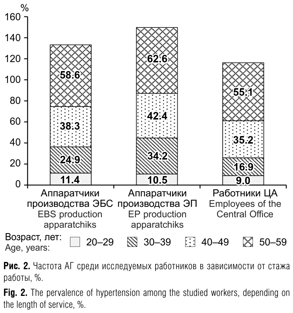 При сравнении распространённости АГ среди различных профессиональных групп было установлено, что у аппаратчиков производства ЭП (34,3%) и аппаратчиков производства ЭБС (31,8%) она встречалась чаще, чем у работников ЦА (27,2%).