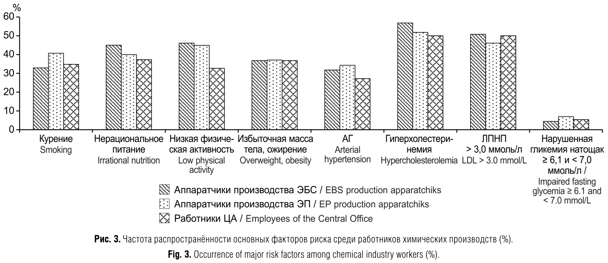 Результаты. Исследования показали, что распространённость артериальной гипертензии среди работников производства этилена и пропилена была выше (34,3%), чем на производстве этилбензола и стирола (31,8%), а также среди работников Центра автоматизации (27,2%). В группе аппаратов производства этилена и пропилена наибольшую роль в развитии артериальной гипертензии играли стаж работы во вредных условиях (20,6%), курение (20,2%), возраст (18,1%), избыточная масса тела (11%) и нарушения липидного обмена. Анализ показал, что наибольший вклад в риск артериальной гипертензии у работников производства этилбензола и стирола вносили стаж (23,8%), возраст (13,6%), избыточная масса тела (7,1%), курение (6,1%) и липидные нарушения.