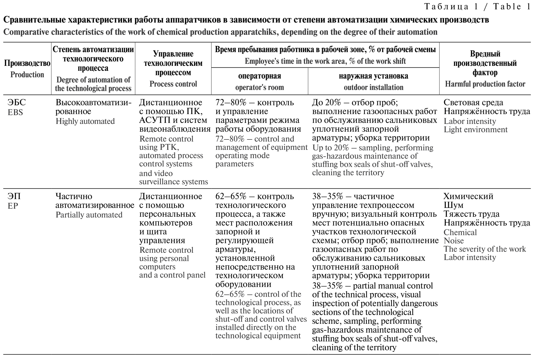 Сравнительные характеристики работы аппаратчиков в зависимости от степени автоматизации изученных производств представлены в табл. 1.