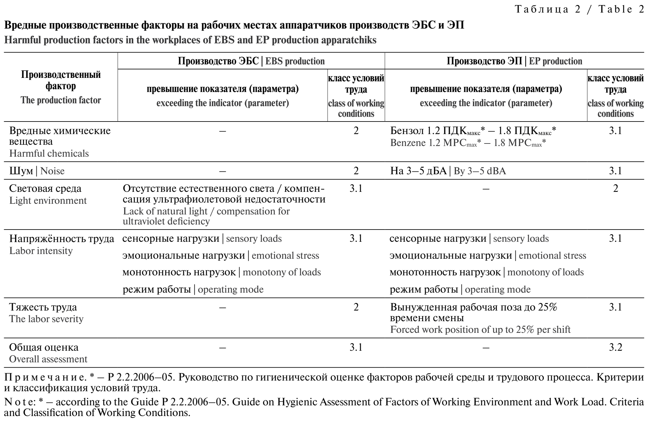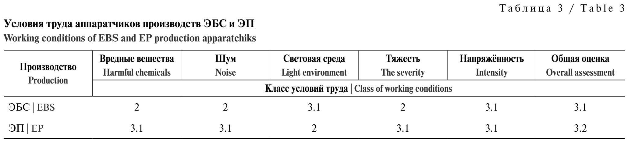 Общая оценка условий труда у аппаратчиков производства ЭБС соответствовала классу 3.1, у аппаратчиков производства ЭП – 3.2 (табл. 3).