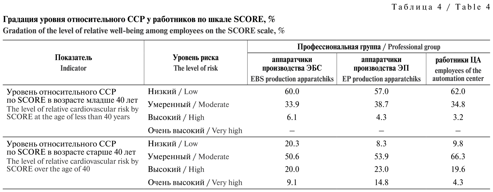 Сравнительный анализ уровня сердечно-сосудистого риска у работников разных профессий в возрасте до 40 лет показал, что среди аппаратчиков производства ЭП процент сотрудников с высоким риском был выше, чем среди работников производств ЭБС и ЦА: 6,1; 4,3 и 3,2% соответственно. При оценке общего сердечно-сосудистого риска по шкале SCORE у работников в возрасте 40 лет и старше было установлено, что большинство принадлежит к группе умеренного риска. При этом максимальные показатели риска чаще всего относились к возрастной группе старше 55 лет. Среди аппаратчиков производства ЭП доля работников с высоким и очень высоким риском несколько превышала аналогичные показатели в других группах.