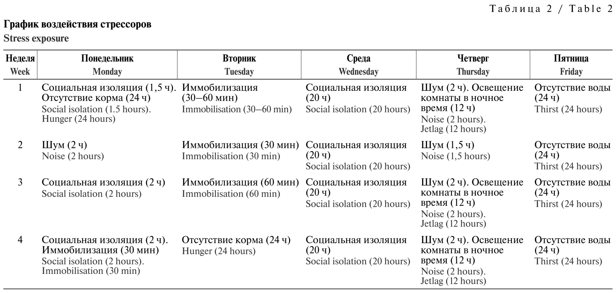 Моделирование состояния хронического стресса у крыс из групп стресса и сочетанного воздействия проводили согласно Matisz и соавт. [14]. Ежедневно на животных данных групп воздействовали стрессорами в соответствии с графиком (табл. 2).