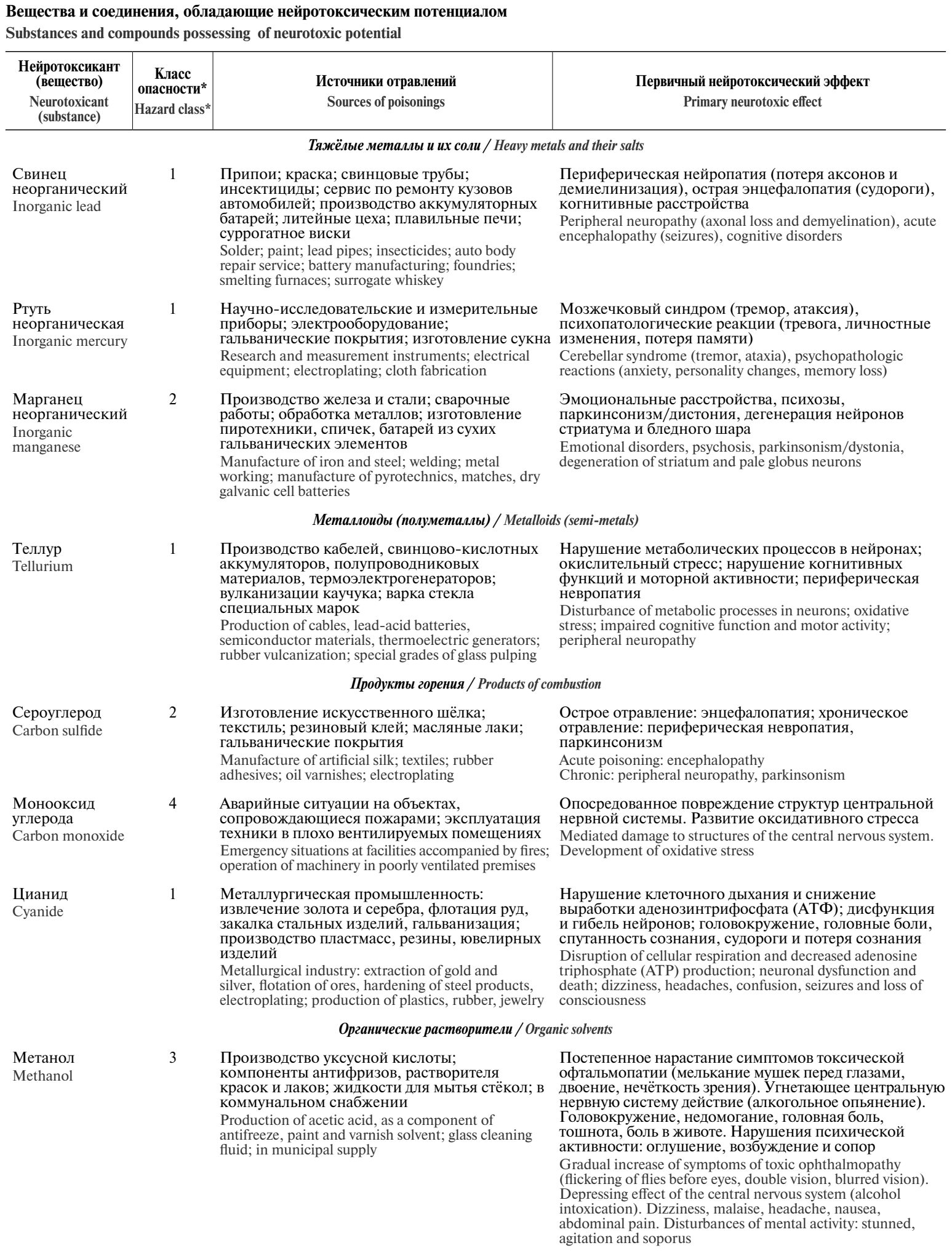 Описанные выше данные обобщены и резюмированы в таблице. За основу взята таблица «Воздействие химических веществ и вызываемые ими нейротоксические синдромы. Клинические синдромы интоксикаций нервной системы») [50], дополненная данными авторов. В таблице перечислены нейротропные токсиканты и вызываемые ими нейротоксические эффекты поражения нервной системы.